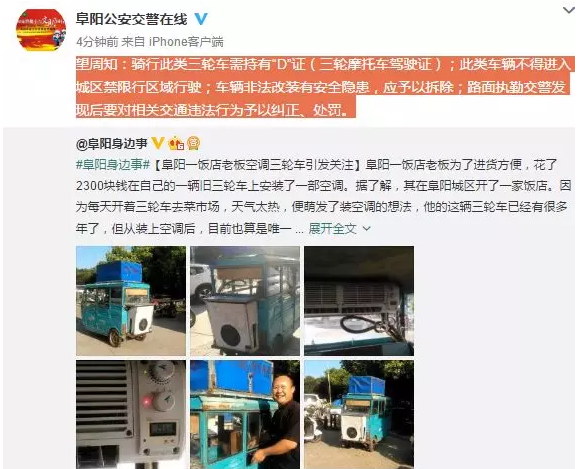阜阳男子在三轮车上装空调!违规or合法?