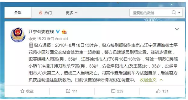 昨日下午15:23分,新浪微博认证为南京市公安局江宁分局新浪微博社区委员会专家成员的@江宁公安在线 发布了一则警方通报《阜阳一对夫妻在南京市江宁区被人持刀砍杀身亡》,具体内容如下。