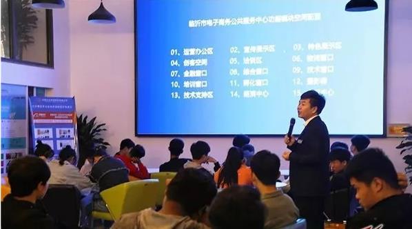 参观领导和学生一行首先到达临沂市电子商务公共服务中心(齐鲁E谷电商产业园A座)一楼服务大厅进行参观,通过大屏幕了解了临沂市电子商务公共服务中心的功能模块空间配置、常驻服务机构、公共服务平台服务模块、中心服务保障体系以及齐鲁E谷电商产业园园区的功能区域分布、电商服务和电商发展情况等。同时浏览了临沂市电子商务公共服务平台网站。