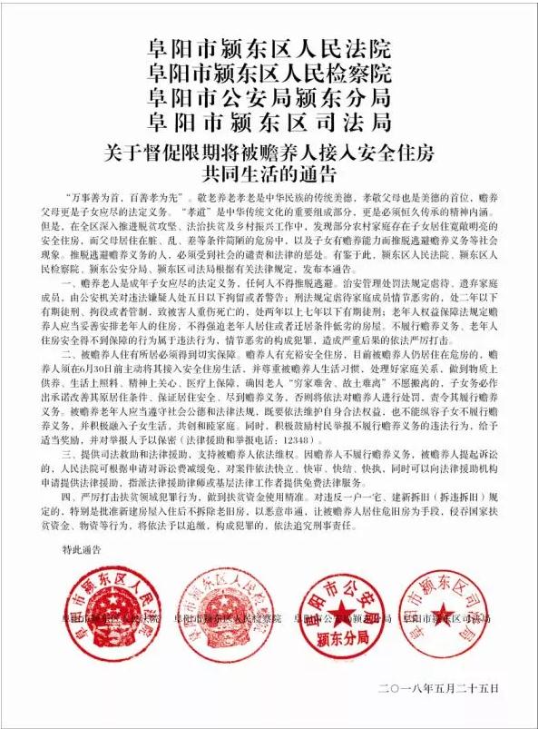 有鉴于此,中共阜南县委政法委员会、县人民法院、县人民检察院、县公安局、县司法局发此通告。赡养义务人有安全住房,被赡养人仍居住在危旧房屋的,赡养义务人须在两个月时间内主动将其父母接入其住房共同生活,并尊重父母的生活习惯,处理好家庭成员关系,确保老人住得安稳、生活舒心;确因老人故土难离,旧房难舍,子女务必保证原住房安全、衣食无忧。否则政法机关将自7月30日视情节对赡养义务人进行相应处罚,并责令其履行赡养扶助义务。拒不履行的,由被赡养人所在村委会协助,被赡养人申请司法行政部门指定法律援助律师代为起诉追究赡养义务人的法律责任。赡养人与被赡养人恶意串通,以让被赡养人居住危旧房为手段骗取、套取国家扶贫资金的,依法予以追缴;构成犯罪的,由有关政法机关依法追究其法律责任。