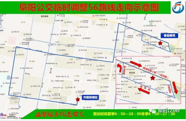 (注:公交56路线在西湖大道(原:一道河路)与颍上路交口西湖大道(原:一道河路七里铺路颍南路颍上路西湖大道(原:一道河路)与颍上路交口路段,单向环绕运营,途径“汽车南站”站、“春益雅苑”站、“春益雅苑南门”站、“天瑞山庄”站实行单边停靠,线路绕行期间,请广大乘客合理选乘其它线路或方式出行,以免耽误您的出行。)