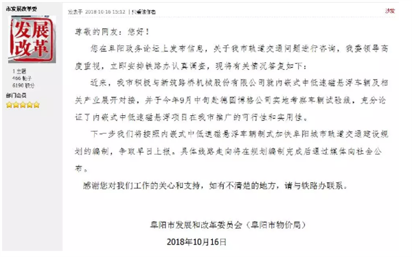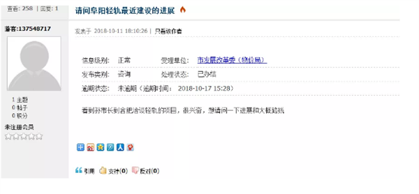 近几年市轨道交通的建设是阜阳人讨论的热点话题阜阳的轻轨啥时候建,怎么建?近日市发改委给出了最新回复!近日,有网友在市政务论坛上留言:“看到孙市长到合肥洽谈轻轨的项目,很兴奋,想请问一下进展和大概路线。