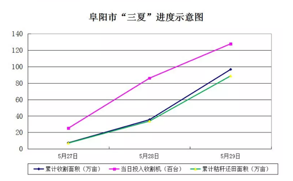 截止5月29日16时,全市已收割小麦96.68万亩,进度为13%,其中颍上53.1万亩,阜南25万亩;当日投入小麦联合收割机12782台(其中跨区作业联合收割机3349台),收割小麦61.2万亩;全市